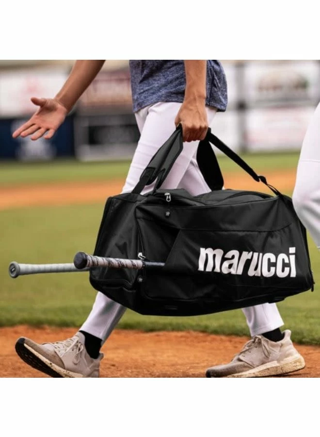 Your new staple duffel bag. The Team Utility Duffel features a large compartment with internal zipper pouches to carry and organize all of your gear. External bat sleeves secure up to two bats, so you have everything you need while you are on the move.