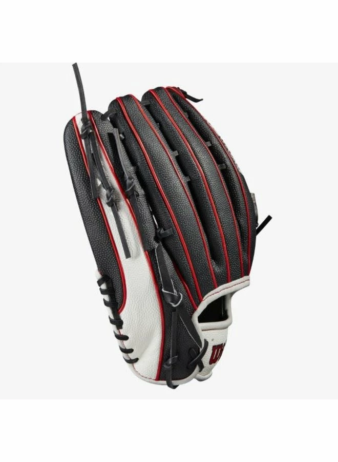 The Black Pro Stock leather palm and 6 Finger Web includes Spin Control Technology – a patented surface texture engineered to increase friction against the ball, helping players handle sinking line drives and secure tough catches. Black and White SuperSkin™ reduces glove weight and repels moisture from rain or wet grass, and gradient Bold Logos complete the modern look.